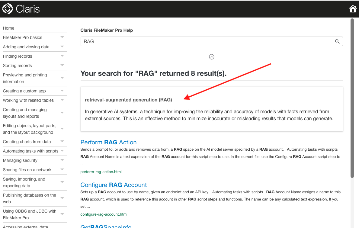 I also really like this new feature in the Claris Help. If you search for a term like “RAG,” you get a quick definition pop-up as well as the relevant help articles. So great!