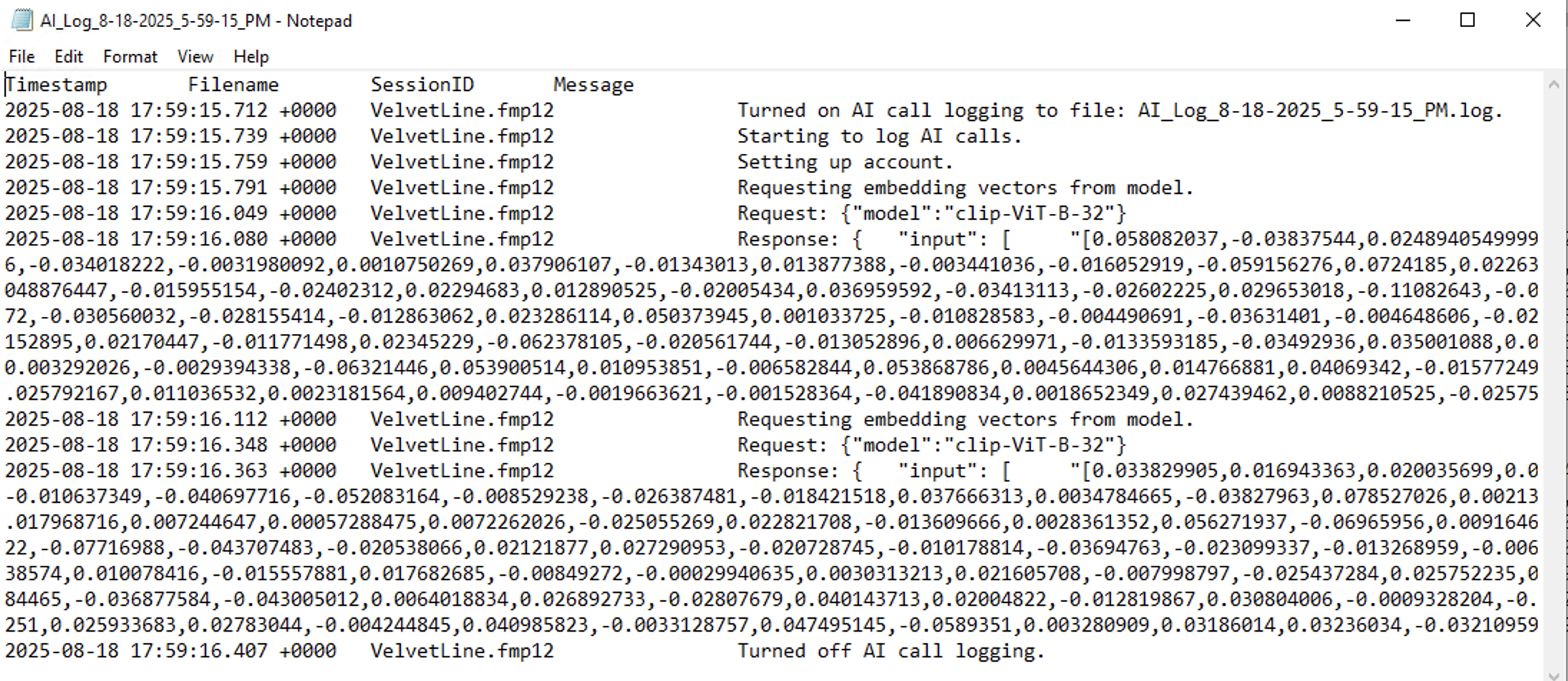 If you are running the FileMaker AI server to host your embedding model (see AI-Powered Image Recognition in FileMaker Part 1 ), you will see the AI Logs in the Logs folder on your server. There are two primary log files: fm_LLMOS_Debug.txt