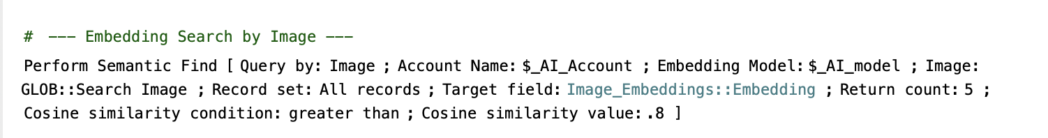 Search by Image | You pass an image directly to the Perform Semantic Find script step | Fast, easy, user-friendly | Cosine similarity scores are not exposed |