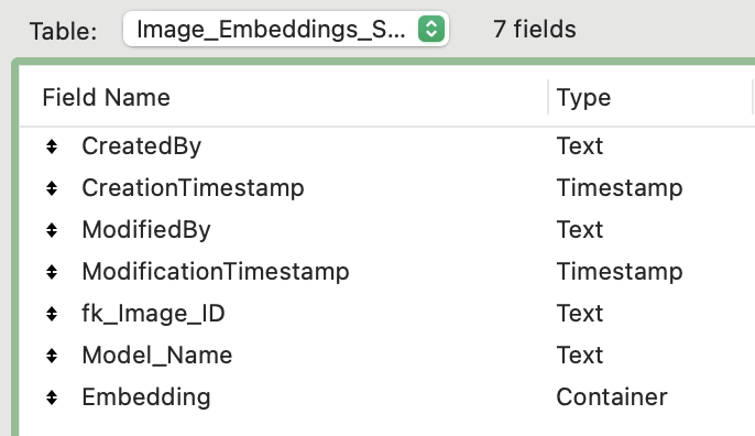 - Add fields to your FileMaker table for image storage and embedding vectors.