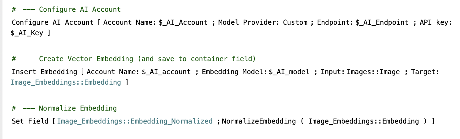function to normalize embeddings before storing. - Set Field [ Image_Embedding_Vector ; NormalizeEmbedding ( Image_Embedding_Vector ) ]